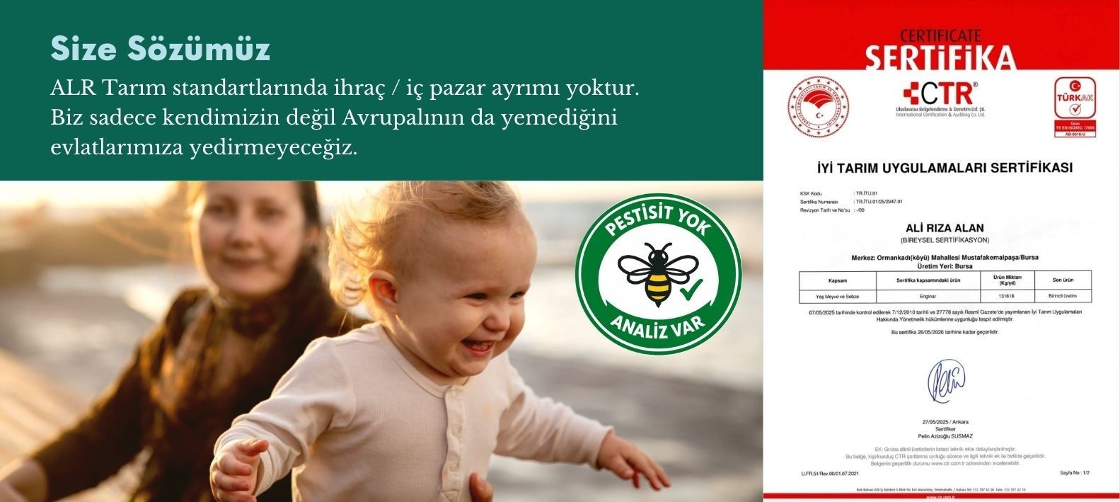 Bursada enginar deyince akla gelen ilk isim. ALR TARIM. Enginar Üreticisi. Bursa'nın Mustafakemalpaşa ilçesine bağlı Ormankadı Mahallesi'nde 200.000m2 alanda yılda 400.000 Bursa Moru enginar üretiyoruz. Yalnız bizi diğer üreticilerden ayıran ciddi özellikler var. Mesela tek bizde olan İyi Tarım Uygulamaları Sertifikamız var. Hani o 'İlaçsız Olsun' dediğiniz enginar işte bizde var. Sulama Suyunu bile analiz ediyoruz. 'Kılçık yok değil mi evladım' diyorsunuz ya.. Biz işte onun da analizini yapıyoruz. Yetkili laboratuvarda kıvam, kılçık, kuru madde, içerik analizlerinde değerlerimiz standartların çok üzerinde. Bitti mi' Hayır.. Alanında uzman şeflerle lezzet ve tadım testleri yapıp onu da belgeliyoruz. Yani biz laf değil iş üretiyoruz. İddialarımızı bilimsel yolla ispatlıyoruz. Hedefimiz şu. 3 Yıl sonra müşterilerimiz doğrudan ALR Tarımdan ön siparişlerini verecek. İsterlerse üretim sürecini yakından takip edebilecek ve bizim iş ortağımız haline gelecek. Ayağında çizme, sırtında yelekle ama çağdaş bir vizyonla Bursalı bir üretici lafta kalmayan topraktan sofraya uzanan bu yolculukta, sizin için en iyisini sunmaya devam edecek.