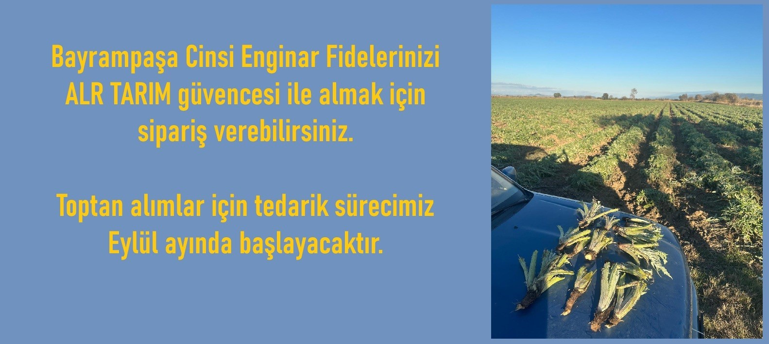 ALR Tarım Bursa'nın Mustafakemalpaşa ilçesine bağlı Ormankadı Mahallesi'nde 250.000m2 alanda yıllık 400.0000 enginar kapasitesiyle tarımsal üretim yapmaktadır. Ürün yelpazesinin lokomotifi Bayrampaşa cinsi enginar oluşturmaktadır. Bu üretim yolculuğunu her aşamasında sizlerle paylaşarak hem müşterilerimizi iş ortağımız haline getireceğiz, hem de tarımsal üretimin ne kadar zorlu bir yolculuk olduğunu paylaşacağız. Topraktan sofraya uzanan bu yolculukta, sizin için en iyisini sunmaya devam edeceğiz.